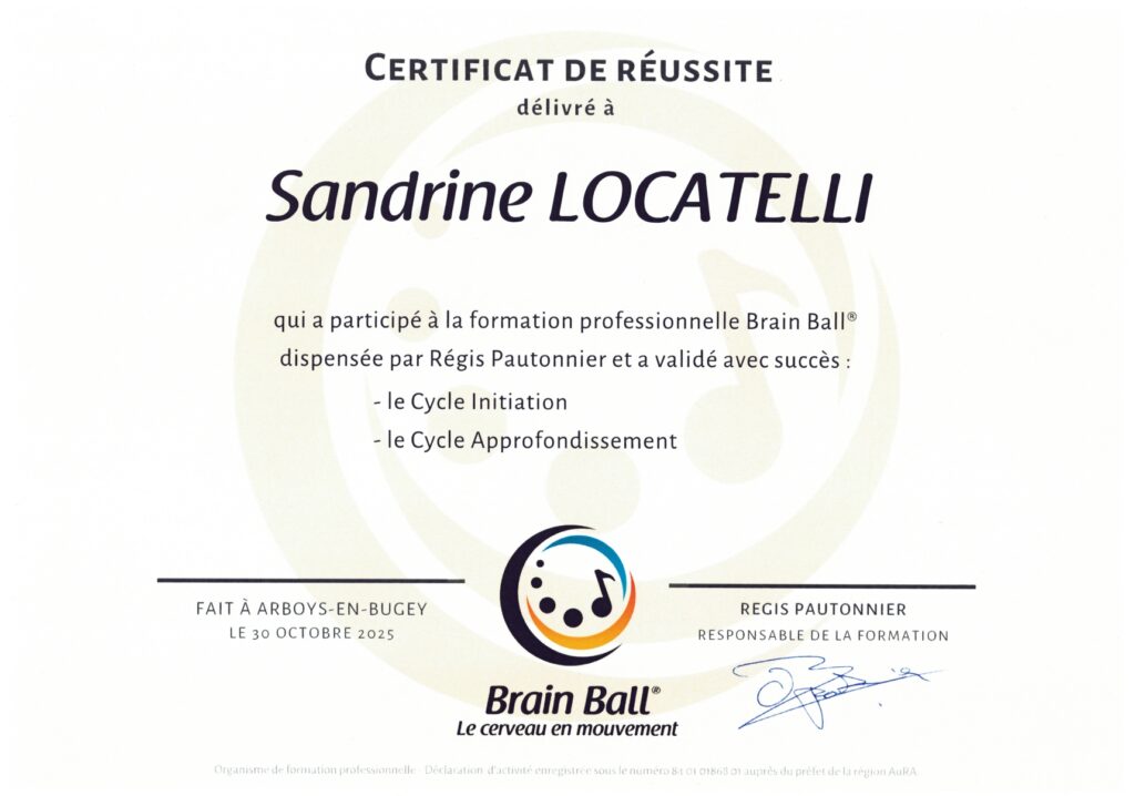 Je suis fière de pouvoir afficher cette certification qui va me permettre désormais de proposer des cycles d’ateliers Brain Ball® sur le territoire du Grésivaudan et de la métropole Grenobloise.
